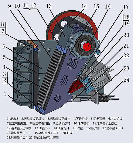 HJ系列高能颚式破碎机主要由机架部、转子部、保险装置、排料口调整装置、润滑系统和调整系统等部分组成。